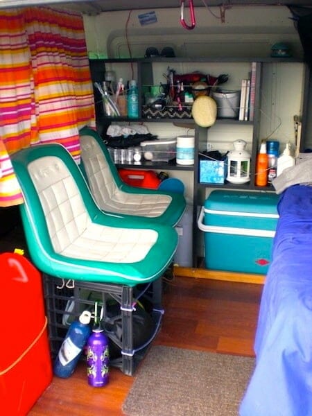- nombre de rangements optimisés : permet de ranger plein de choses que ce soit le bazar dans le van. Ça change la vie car on passe beaucoup de temps dans le van.